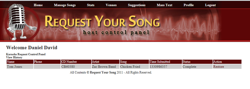 As you are running your karaoke show, things get a little busy. Mistakes can happen. That is why Request Your Song added a view history option from your Host Control Panel. Here you can restore any of your previous singers to their previous status with a single click.